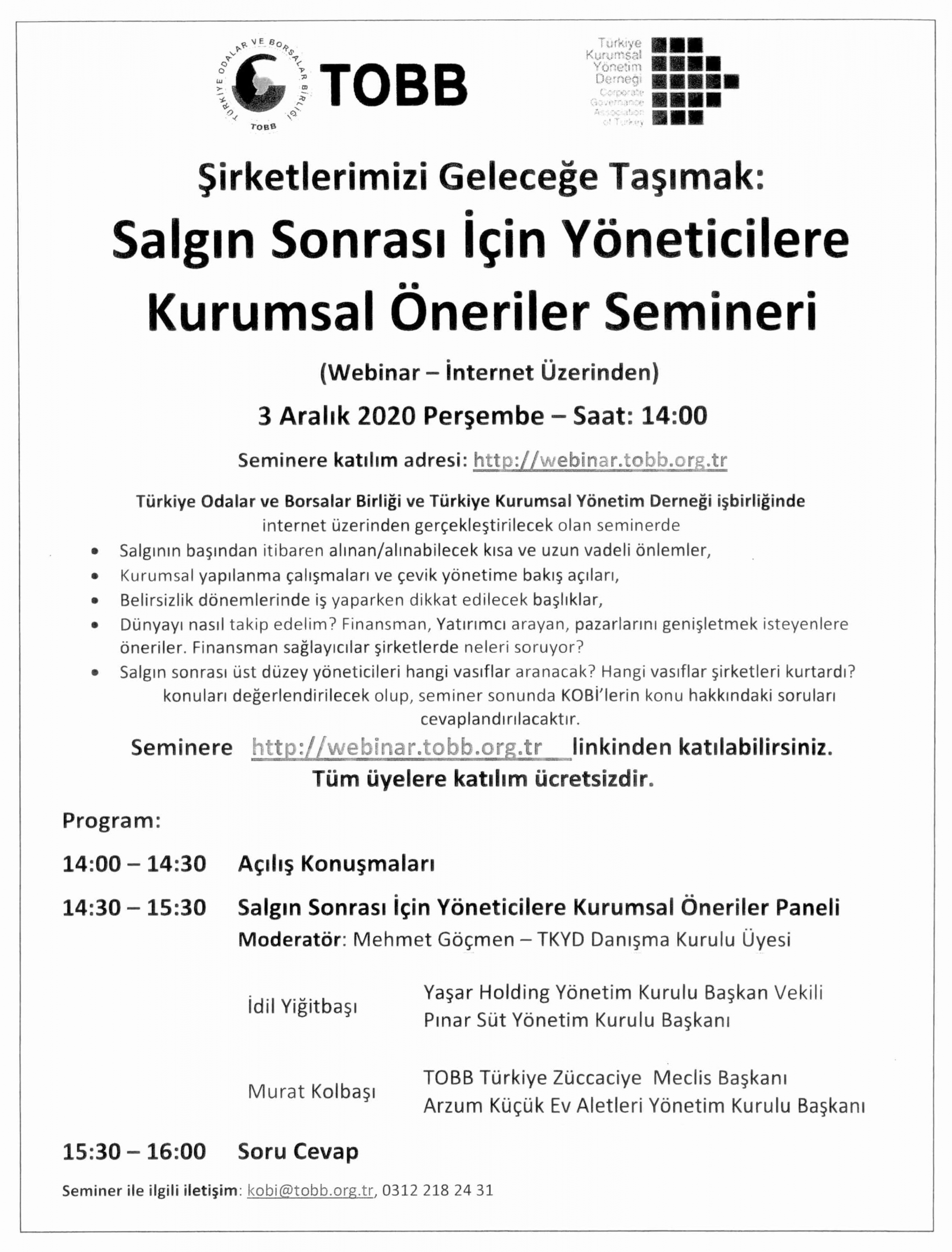 KOBİ sahiplerine ve yöneticilerine yönelik olarak salgın sonrası için kurumsal öneriler hakkında 3 Aralık 2020 tarihinde 14:00’da internet üzerinden bir bilgilendirme semineri gerçekleştirileceği bildirilmektedir.