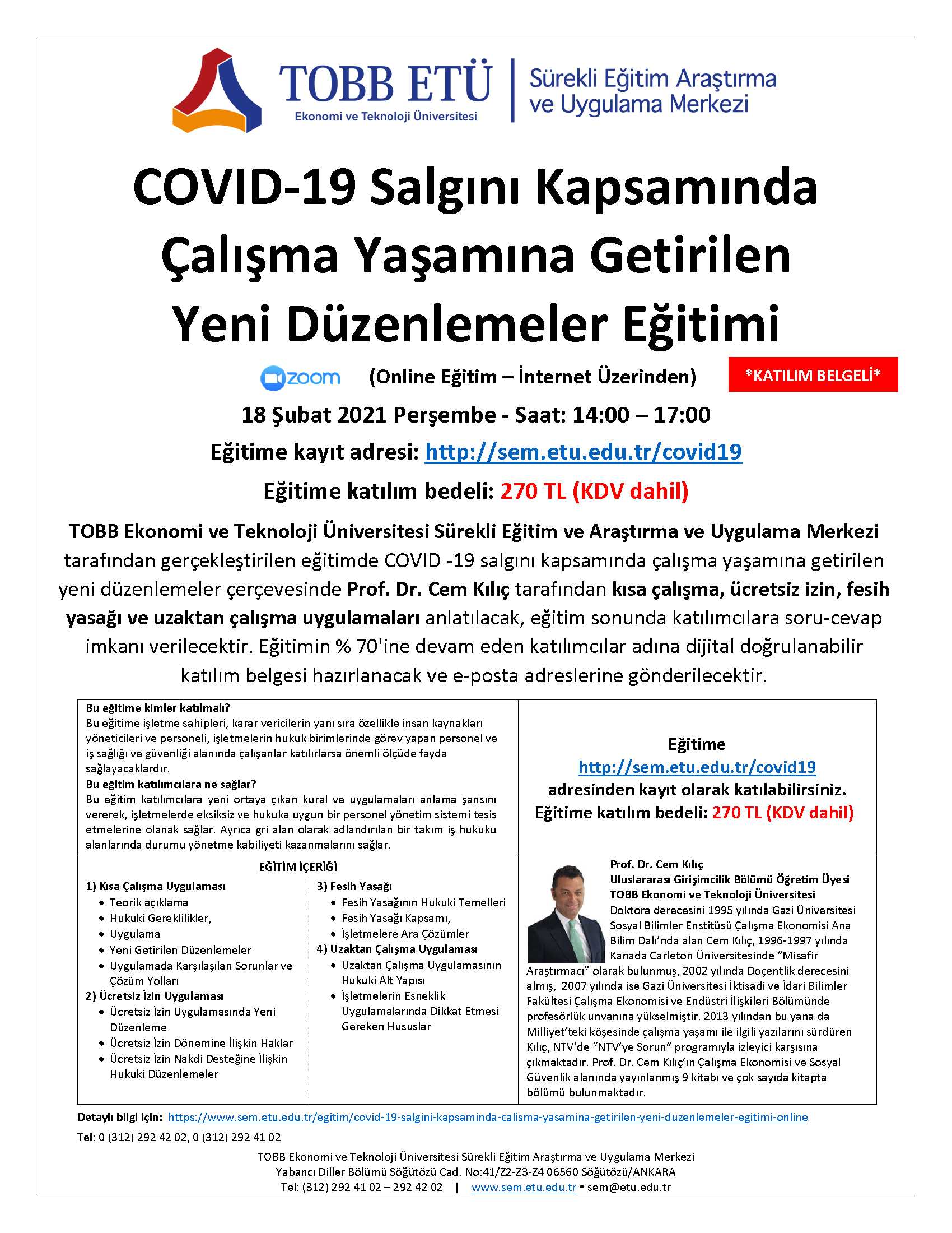 TOBB Ekonomi ve Teknoloji Üniversitesi Sürekli Eğitim ve Araştırma Uygulama Merkezi (TOBB ETÜ SEM) tarafından gerçekleştirilen eğitimde Covid-19 salgını kapsamında çalışma hayatına getirilen yeni düzenlemeler çerçevesinde TOBB ETÜ Öğretim Üyesi Prof.Dr.Cem Kılıç tarafından 18 Şubat 2021 Perşembe günü 14:00-17:00 saatleri arasında bir eğitimi gerçekleştirilecektir.