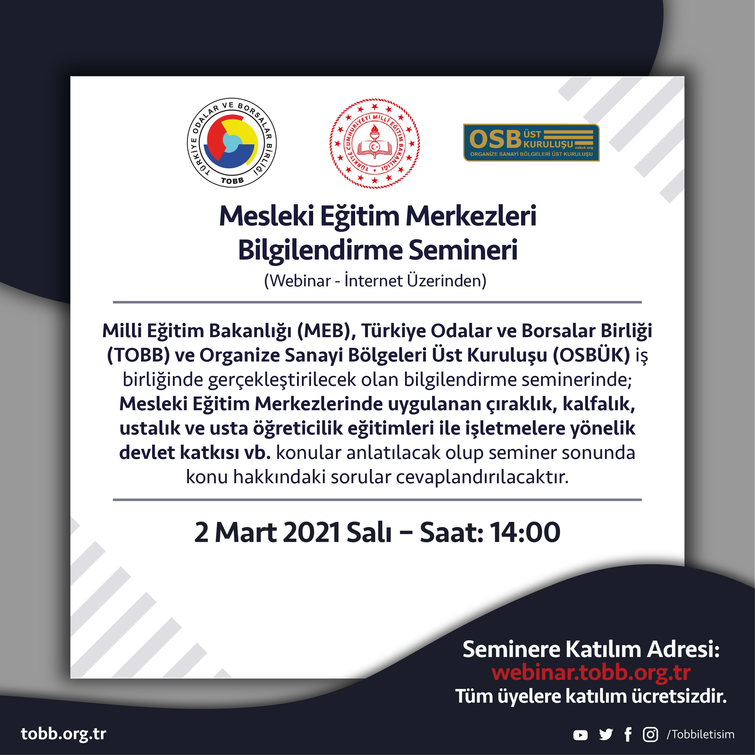 TOBB, MEB ve OSBÜK işbirliğinde 2 Mart 2021 Salı saat: 14:00’te gerçekleştirilecek olan “Mesleki Eğitim Merkezleri Bilgilendirme Webinarı”na katılımınızı bekliyoruz. Detaylar ve kayıt: http://webinar.tobb.org.tr