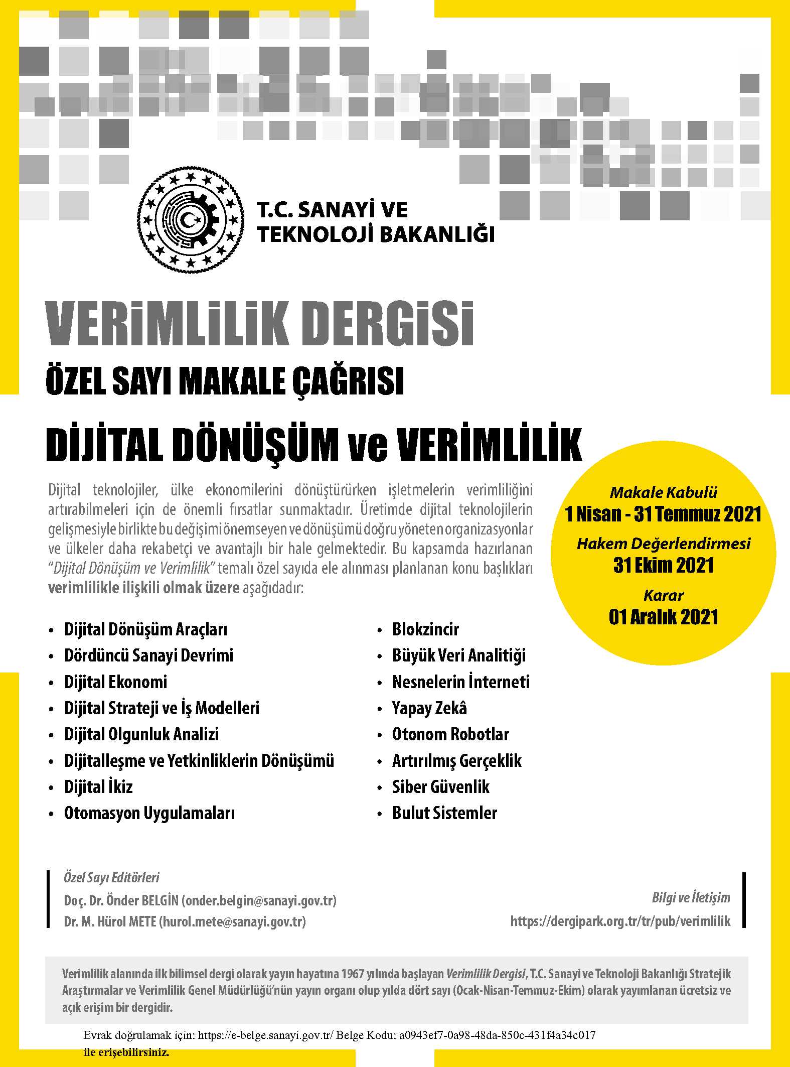 “Verimlilik alanında ilk bilimsel dergi olarak yayın hayatına 1967 yılında başlayan Verimlilik Dergisi, yılda dört sayı (Ocak-Nisan-Temmuz-Ekim) olmak üzere yayımlandığı ücretsiz ve açık erişime sahip olduğu verimlilikle ilgili tüm disiplinlerden gelen, araştırmaya dayalı, ulusal ve uluslararası literatüre katkı sağlayan, Türkçe ve İngilizce özgün ve güncel çalışmalara yer verildiği Verimlilik Dergisinin, 2008 yılından bu yana TR Dizin Sosyal ve Beşerî Bilimler Veri Tabanı’nda taranmakta ve derginin tüm süreçleri, https://dergipark.org.tr/tr/pub/verimlilik internet sayfası üzerinden yürütüldüğü, 2021 yılında derginin normal sayılarına ek olarak “Dijital Dönüşüm ve Verimlilik” temalı bir özel sayısının yayımlanacağı, araştırmacıların çalışmalarını 31 Temmuz 2021 tarihine kadar iletmeleri gerekmekte” denilmektedir. Bu bağlamda yukarıdaki hususlar ile özel sayı sürecine ilişkin duyuru afişi yazımız ekinde mevcut olup, konuyu bilgi ve değerlendirmenize sunarız.