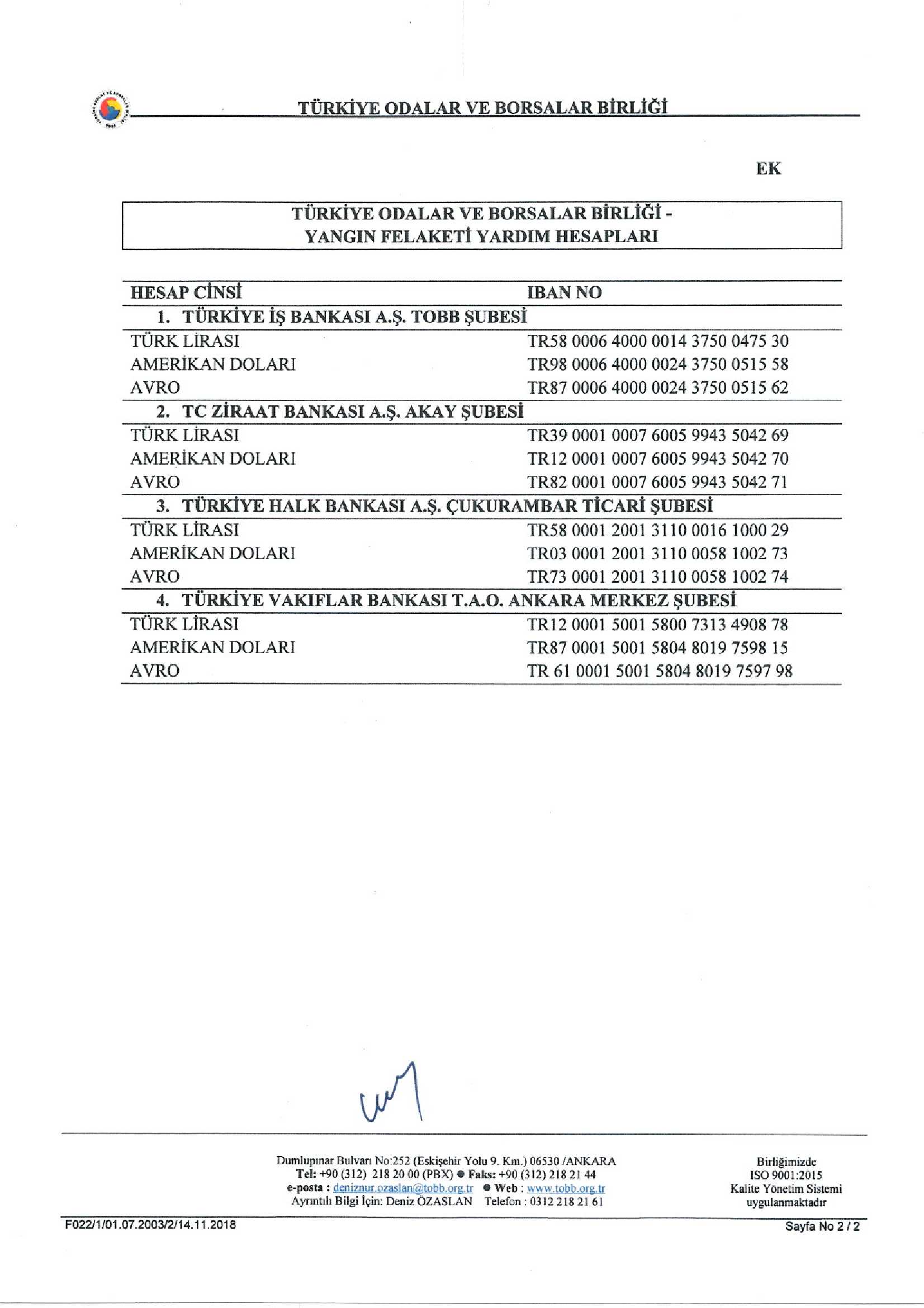 Yazıda kampanya için iletilecek yardımların TOBB tarafından bu amaca yönelik açılan ve ekte yer alan hesaplarda toplanacağı ve bağış tutarlarının TOBB tarafından oluşturulan yetkili kurulun denetiminden sonra ilgili kamu idaresinin hesaplarına nakledileceği ifade edilmiştir.