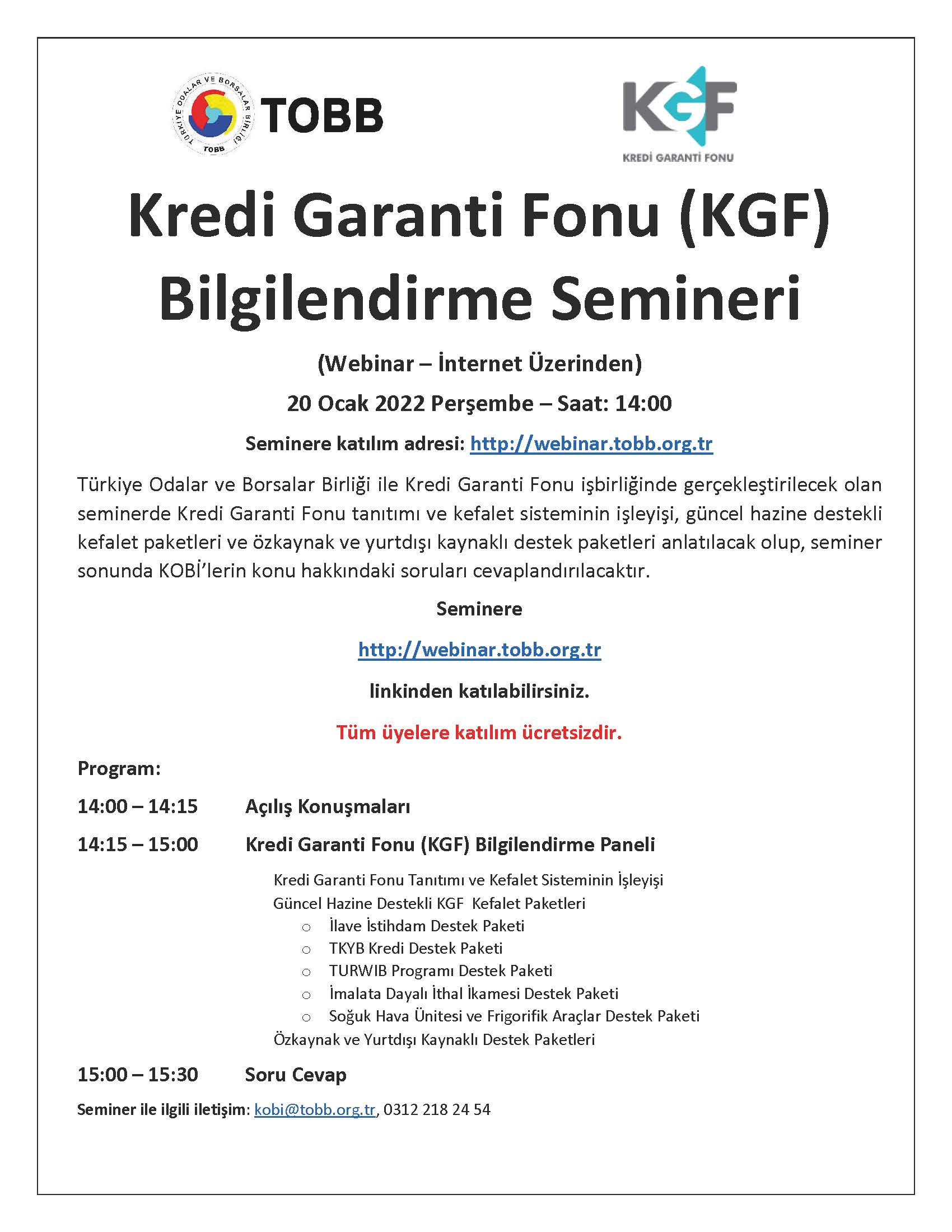 Teminat yetersizliği nedeniyle kredi alamayan işletmelere kefil olan ve bu işletmelerin finansmana erişmelerinde destekleyici mekanizmaları bulunan “Kredi Garanti Fonu (KGF) hakkında; 20 Ocak 2022 Perşembe günü saat 14:00’te internet üzerinden seminer gerçekleştirilecektir. Seminere ilişkin davet ekte sunulmaktadır.