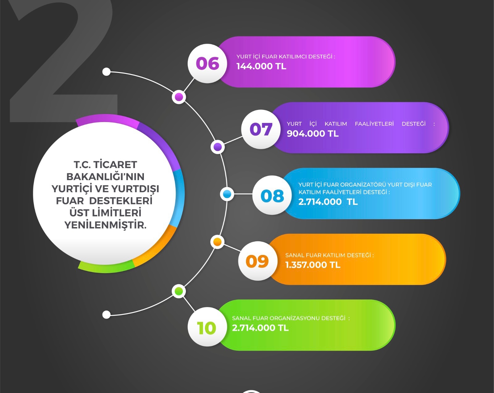 Ticaret Bakanlığı’nın 06.01.2023 tarihli, 81690590 sayılı ve Destek Üst Limitleri konulu ilgi yazısı ile; ihracatçıların yurt dışındaki fuarlara stant ile katılımları ve yurt dışı fuar organizasyonlarının tanıtımına yönelik yetkilendirilmiş yurt dışı fuar organizatörlerinin tanıtım faaliyetlerine yönelik olarak sağlanacak desteklere ilişkin üst limitlerin düzenlediği “5973 Sayılı İhracat Destekleri Hakkında Karar”ının 30’uncu maddesinde yer alan ‘Bu karar kapsamındaki destek üst limitleri her takvim yılı başında (TÜFE + Yİ-ÜFE)/2 oranında güncellenir.’ hükmüne istinaden güncellenen destek üst limitlerine https://ticaret.gov.tr/data/5c500e9e13b87628e000a0d0/2023%20Destek%20%C3%9Cst%20Limitleri.pdf
