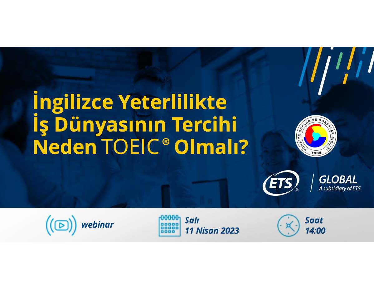 ETS Global tarafından TOBB çatısı altında yer alan kurumlara ve özel sektör işletmelerine yönelik 11 Nisan 2023 Salı günü “İngilizce Yeterlilikte İş Dünyasının Tercihi Neden TOEIC Olmalı?” konulu ücretsiz bir webinar düzenlenecektir. Söz konusu webinarda, TOEIC testinin ne olduğu, iş dünyasına nasıl katkı sağladığı ve daha fazlası katılımcılarla paylaşılacaktır.