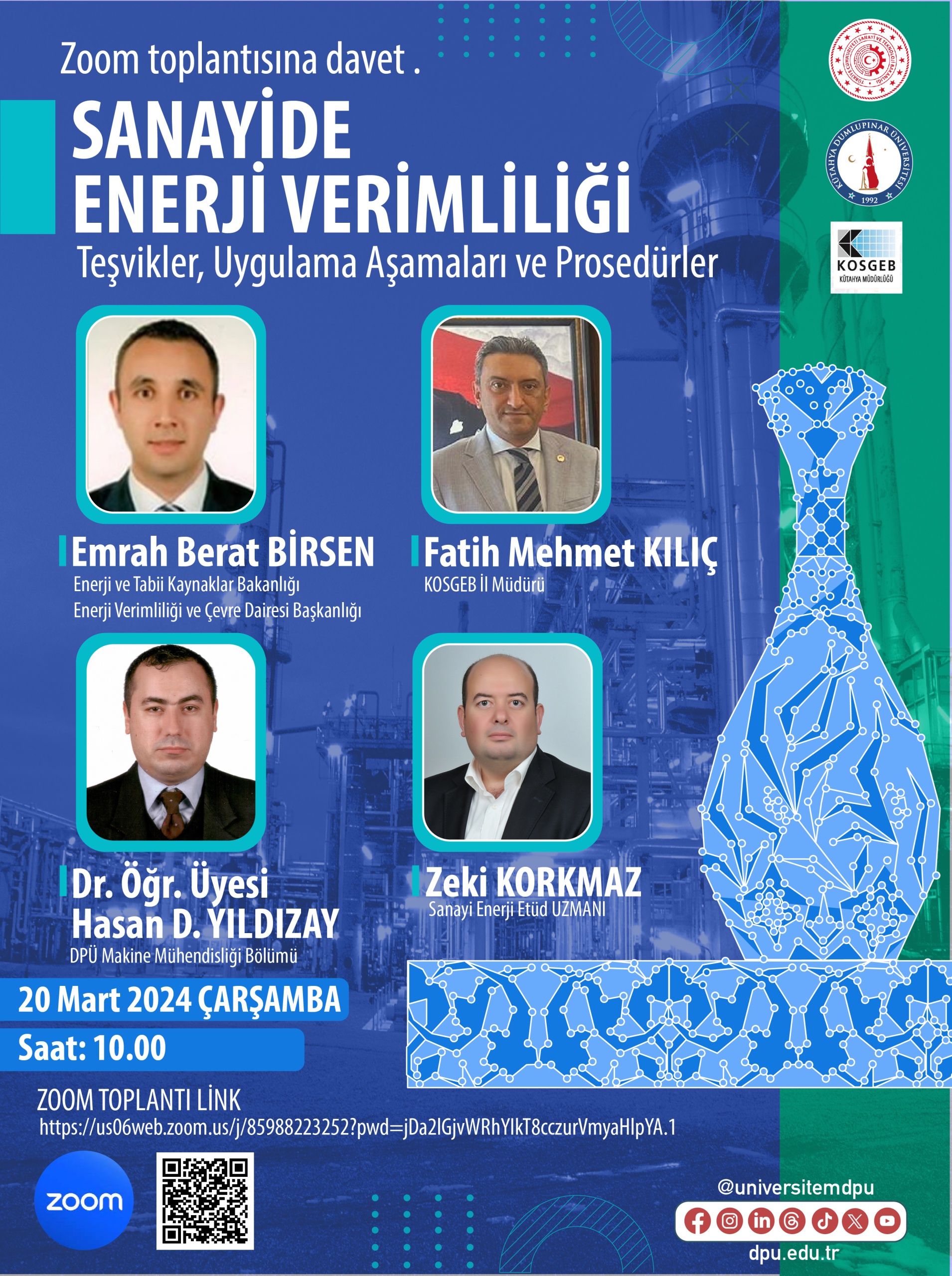 21.12.2023 tarihinde Sanayi ve Teknoloji İşbirliği Kurulu (SANTEK) 2023-2 toplantısında; “İlimizde sanayi sektörü temsilcilerinden OSB’lerde yer alanlar için 1, OSB dışında faaliyet gösteren sanayiciler için 1 olmak üzere 2 adet “Sanayi sektörü enerji verimliliğinde farkındalığın artırılması” konulu panel veya bilgilendirme toplantısı yapılması kararı alınmış ve bu etkinlik için; Kütahya TSO, Simav TSO, Gediz TSO, Tavşanlı TSO, Dumlupınar Üniversitesi Rektörlüğü, Sanayi Teknoloji İl Müdürlüğü, KOSGEB Müdürlüğü ve OSB Müdürlükleri görevlendirilmiştir. Söz konusu bilgilendirme toplantısı için Valilik Makamından alınan Ek-1 Onay ile 20 Mart 2024 Çarşamba günü saat 10:00-12:00 arasında çevrimiçi olarak (Zoom programı üzerinden ) “Sanayide Enerji Verimliliği – Teşvikler Uygulama Aşamaları ve Prosedürler” konulu toplantı gerçekleştirilecek olup toplantıya ilişkin afiş Ek-2’de paylaşılmaktadır. Bu sebeple görevli kurumlar olarak toplantıya ilişkin bilgilerin ve afişin üyeleriniz, bölgenizde üretim yapan ilgili ve ilişkili işletmeler ile paylaşılarak gerekli hazırlıkların yapılıp azami katılım ve desteğin sağlanması hususu bildirlmekte olup, konuyu bilgi ve değerlendirmenize sunarız.